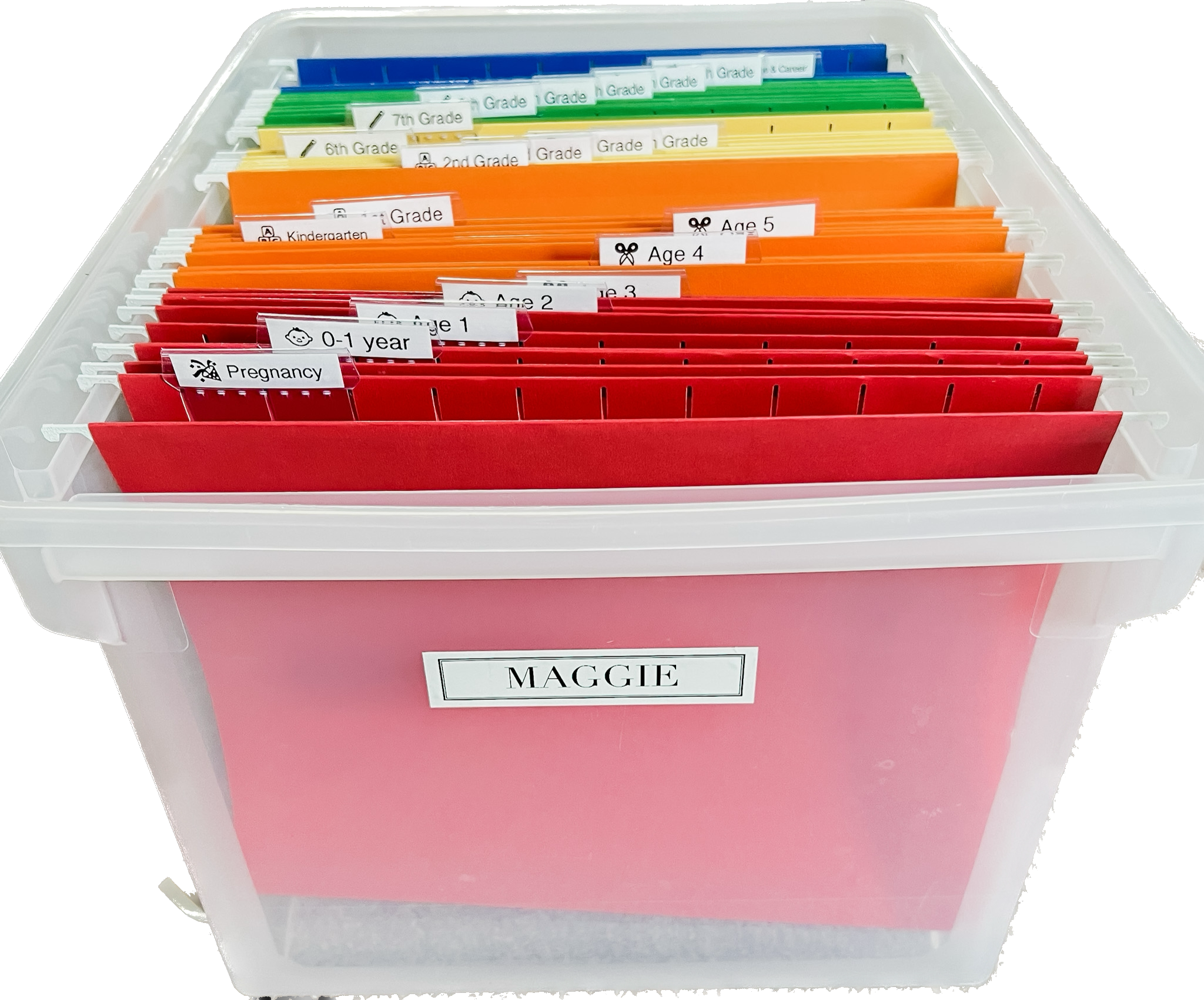 Each file box contains the 20 labeled folders listed below, as well as 5 optional folders described on the order form.